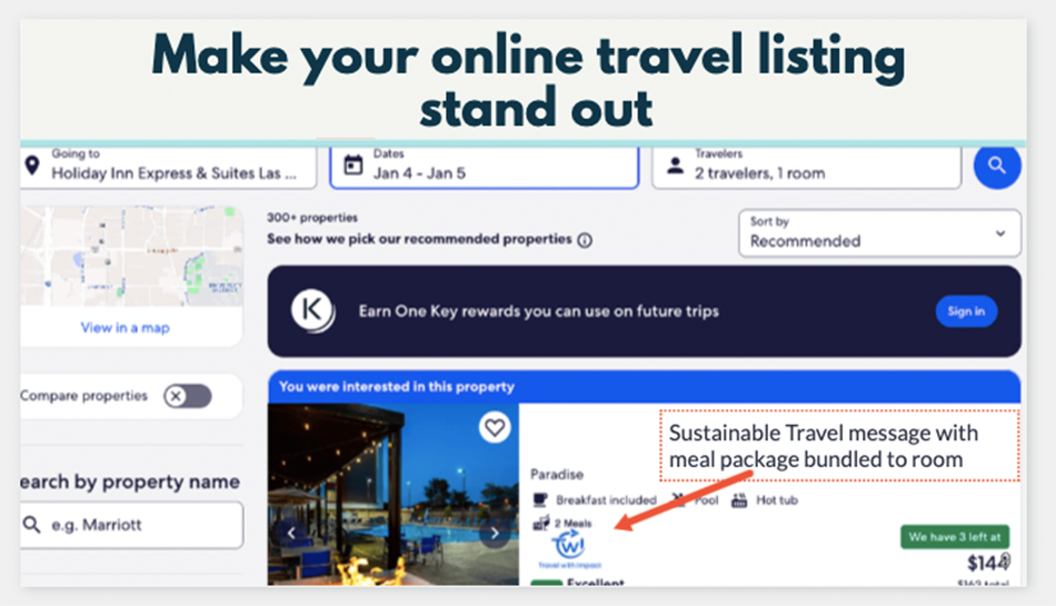 We are here to help you meet the responsibility to the community to ensure that as many people as possible and the society at large all thrive as a result of your business.It is our commitment to promote you as leaders in hospitality for sustainable travel. When your hotel bundles meals with a guests stay, we donate a meal to a local hunger relief center. Together, we can make sustainable travel the norm not an after thought.